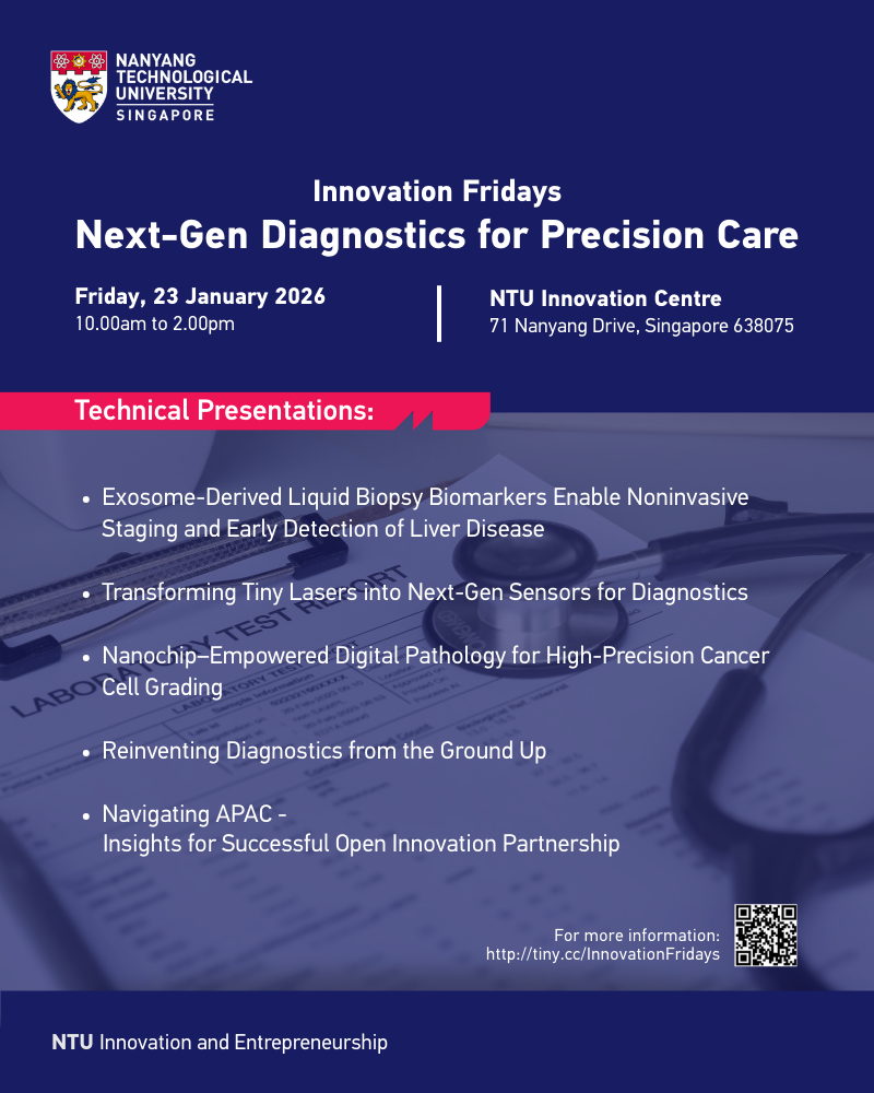 Join us at Innovation Fridays to explore breakthrough diagnostic innovations shaping the future of precision care. Meet researchers from Nanyang Technological University developing next-generation platforms—from liquid biopsy and laser-based sensing to nanochip-enabled digital pathology.